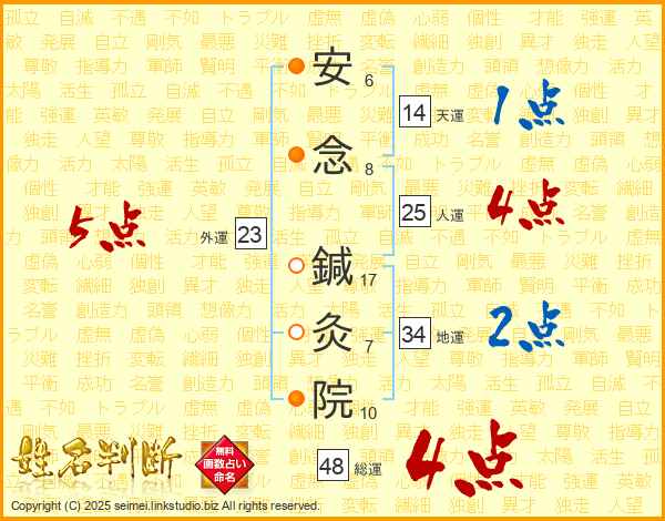 安(6画)念(8画) 鍼(17画)灸(7画)院(10画)