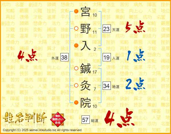 宮(10画)野(11画)入(2画) 鍼(17画)灸(7画)院(10画)