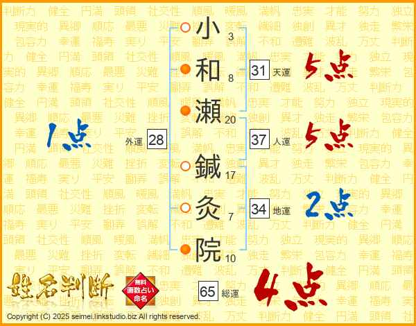 小(3画)和(8画)瀬(20画) 鍼(17画)灸(7画)院(10画)