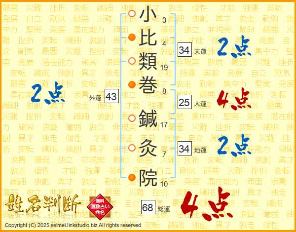 小(3画)比(4画)類(19画)巻(8画) 鍼(17画)灸(7画)院(10画)
