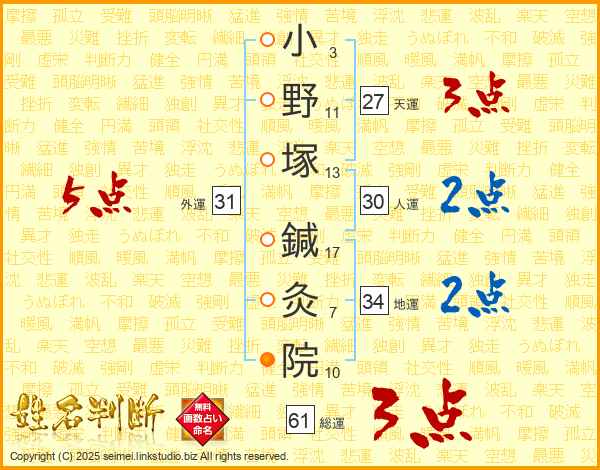 小(3画)野(11画)塚(13画) 鍼(17画)灸(7画)院(10画)