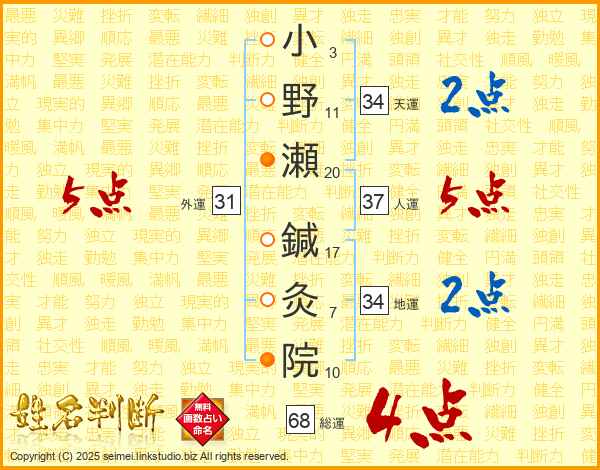 小(3画)野(11画)瀬(20画) 鍼(17画)灸(7画)院(10画)