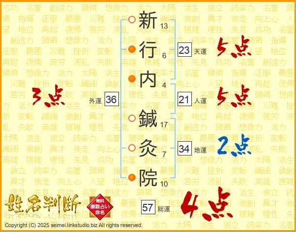 新(13画)行(6画)内(4画) 鍼(17画)灸(7画)院(10画)