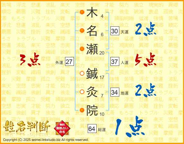 木(4画)名(6画)瀬(20画) 鍼(17画)灸(7画)院(10画)