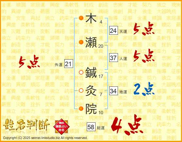 木瀬鍼灸院さんの総運は58画の4点!