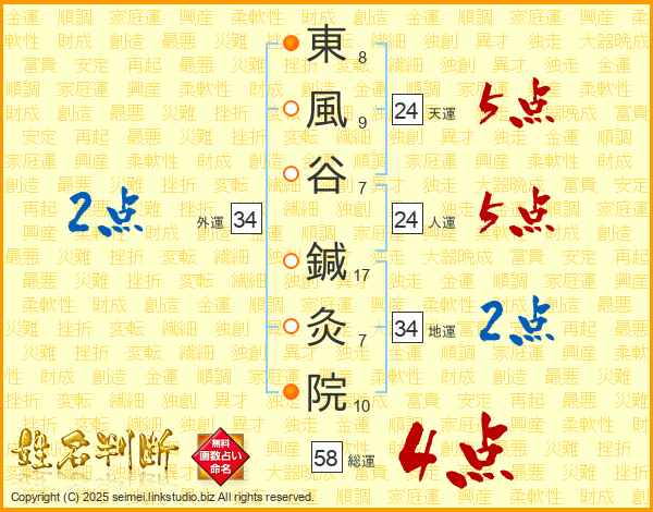 東(8画)風(9画)谷(7画) 鍼(17画)灸(7画)院(10画)