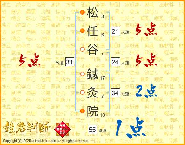 松(8画)任(6画)谷(7画) 鍼(17画)灸(7画)院(10画)