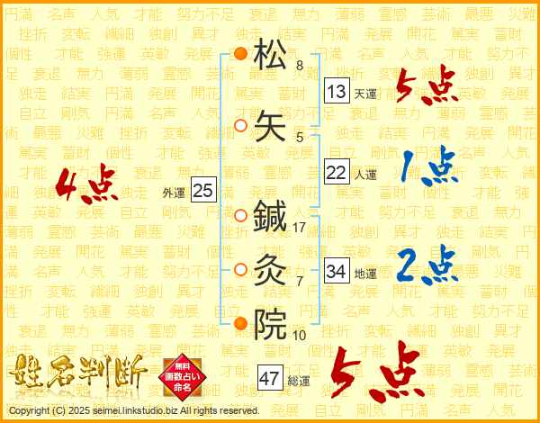 松(8画)矢(5画) 鍼(17画)灸(7画)院(10画)