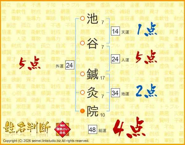 池(7画)谷(7画) 鍼(17画)灸(7画)院(10画)
