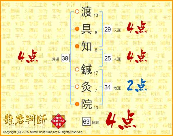 渡(13画)具(8画)知(8画) 鍼(17画)灸(7画)院(10画)