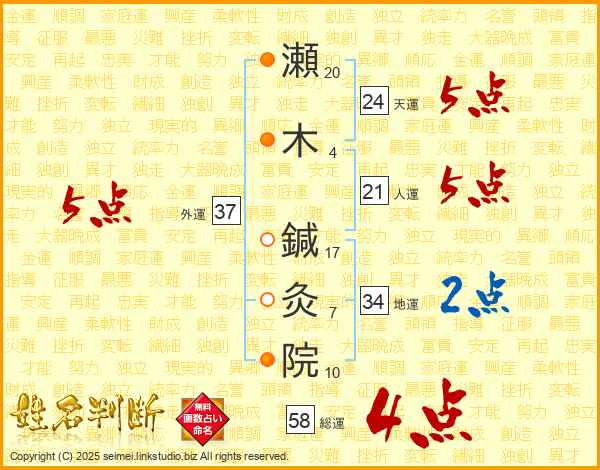 瀬(20画)木(4画) 鍼(17画)灸(7画)院(10画)