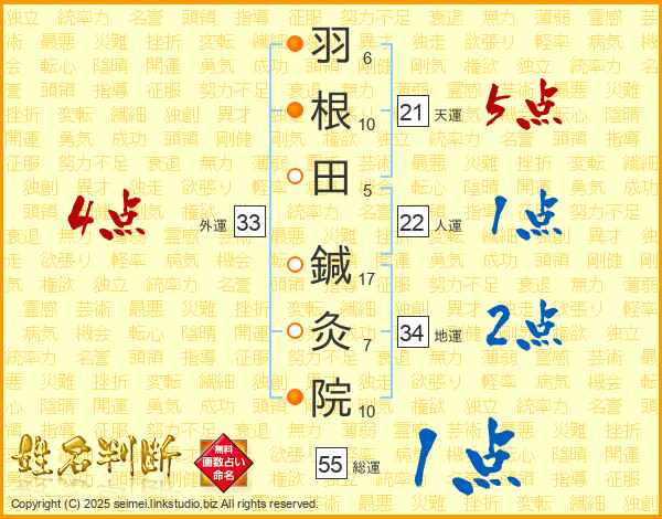 羽(6画)根(10画)田(5画) 鍼(17画)灸(7画)院(10画)