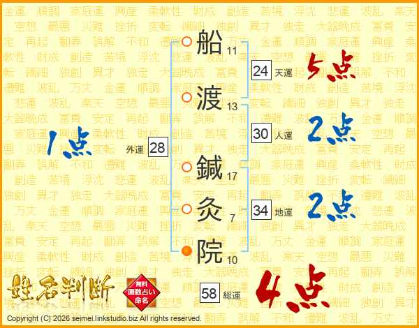船(11画)渡(13画) 鍼(17画)灸(7画)院(10画)