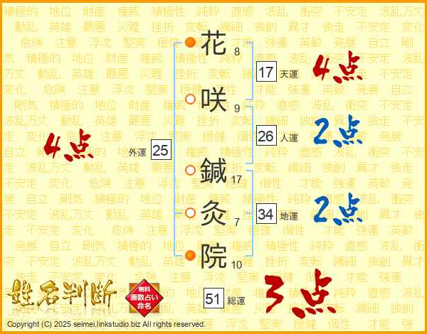 花(8画)咲(9画) 鍼(17画)灸(7画)院(10画)