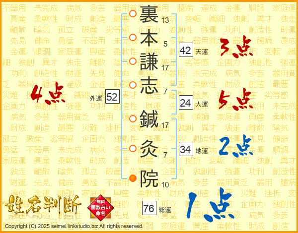 裏本謙志鍼灸院さんの総運は76画の1点!