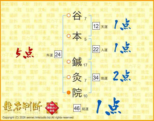 谷(7画)本(5画) 鍼(17画)灸(7画)院(10画)