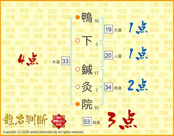 鴨(16画)下(3画) 鍼(17画)灸(7画)院(10画)