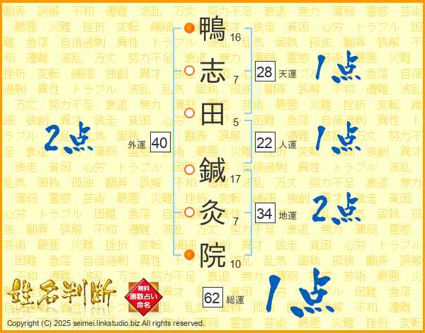 生活面を象徴する運勢です。外部から受ける影響力を表し、結婚運、家庭運や職場、環境への順応性を表します。総運から人運を引いた画数。姓や名が1文字の場合を除く。