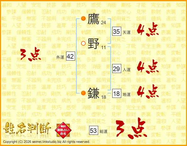 生活面を象徴する運勢です。外部から受ける影響力を表し、結婚運、家庭運や職場、環境への順応性を表します。総運から人運を引いた画数。姓や名が1文字の場合を除く。
