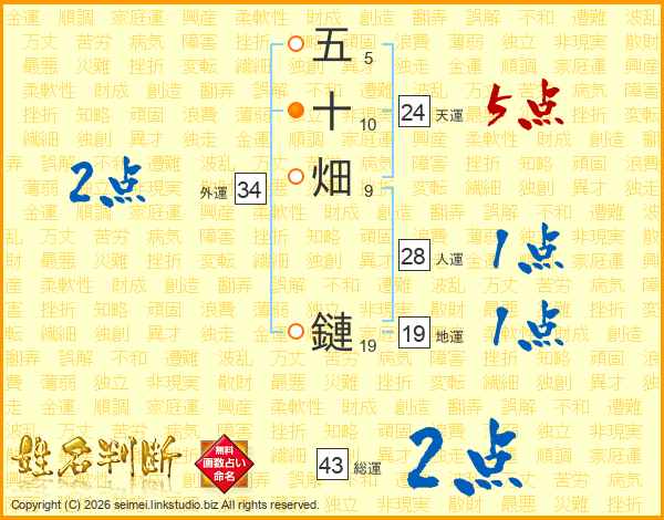 五(5画)十(10画)畑(9画) 鏈(19画)