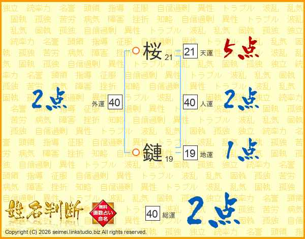 生活面を象徴する運勢です。外部から受ける影響力を表し、結婚運、家庭運や職場、環境への順応性を表します。総運から人運を引いた画数。姓や名が1文字の場合を除く。