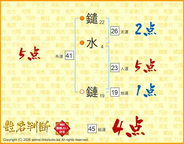 生活面を象徴する運勢です。外部から受ける影響力を表し、結婚運、家庭運や職場、環境への順応性を表します。総運から人運を引いた画数。姓や名が1文字の場合を除く。