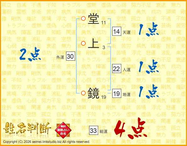 生活面を象徴する運勢です。外部から受ける影響力を表し、結婚運、家庭運や職場、環境への順応性を表します。総運から人運を引いた画数。姓や名が1文字の場合を除く。