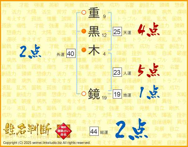 重(9画)黒(12画)木(4画) 鏡(19画)