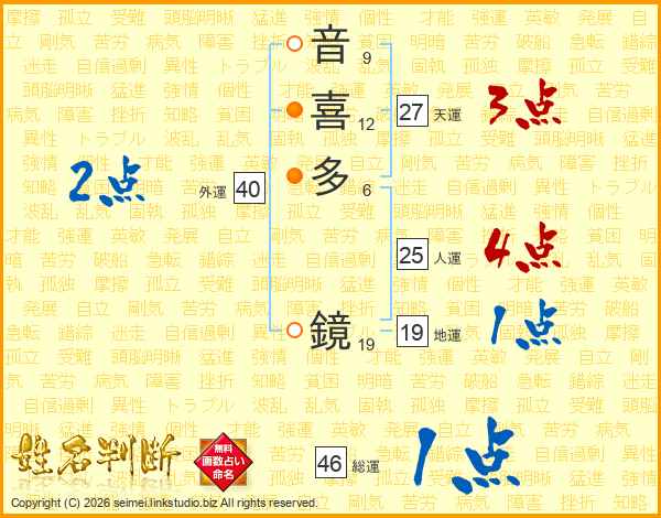 音(9画)喜(12画)多(6画) 鏡(19画)