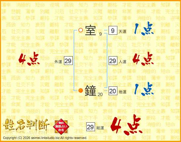 生活面を象徴する運勢です。外部から受ける影響力を表し、結婚運、家庭運や職場、環境への順応性を表します。総運から人運を引いた画数。姓や名が1文字の場合を除く。