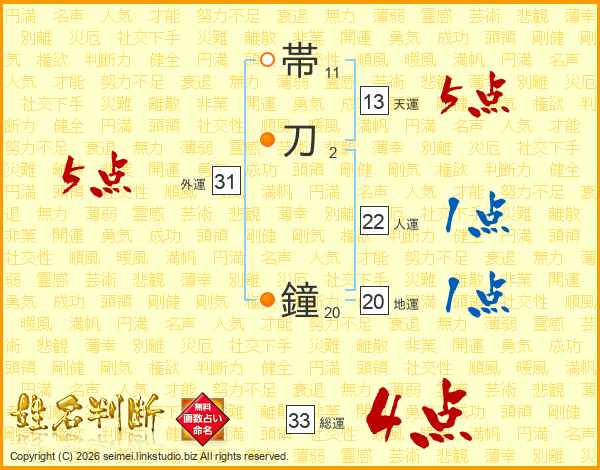 生活面を象徴する運勢です。外部から受ける影響力を表し、結婚運、家庭運や職場、環境への順応性を表します。総運から人運を引いた画数。姓や名が1文字の場合を除く。
