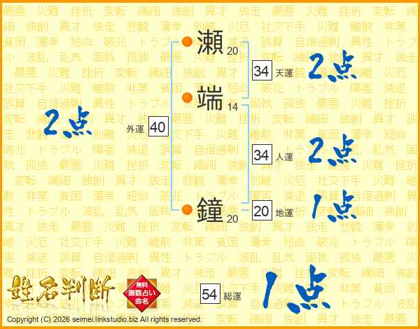 瀬端鐘さんの人運は34画の2点!