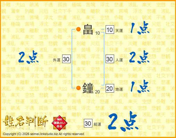 生活面を象徴する運勢です。外部から受ける影響力を表し、結婚運、家庭運や職場、環境への順応性を表します。総運から人運を引いた画数。姓や名が1文字の場合を除く。