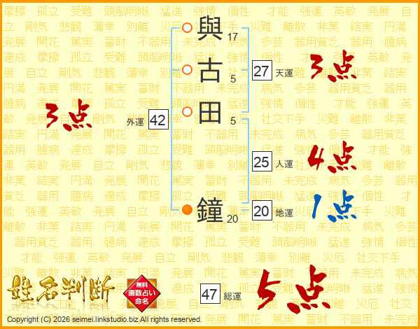與古田鐘さんの総運は47画の5点!