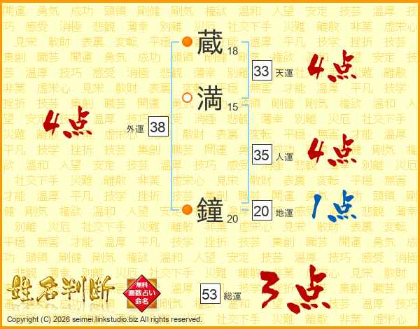 生活面を象徴する運勢です。外部から受ける影響力を表し、結婚運、家庭運や職場、環境への順応性を表します。総運から人運を引いた画数。姓や名が1文字の場合を除く。