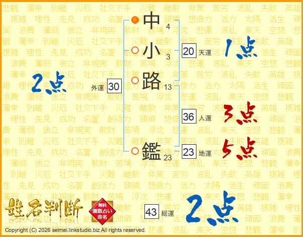 生活面を象徴する運勢です。外部から受ける影響力を表し、結婚運、家庭運や職場、環境への順応性を表します。総運から人運を引いた画数。姓や名が1文字の場合を除く。