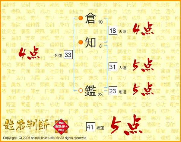 生活面を象徴する運勢です。外部から受ける影響力を表し、結婚運、家庭運や職場、環境への順応性を表します。総運から人運を引いた画数。姓や名が1文字の場合を除く。