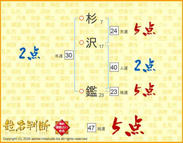 杉沢鑑さんの総運は47画の5点!