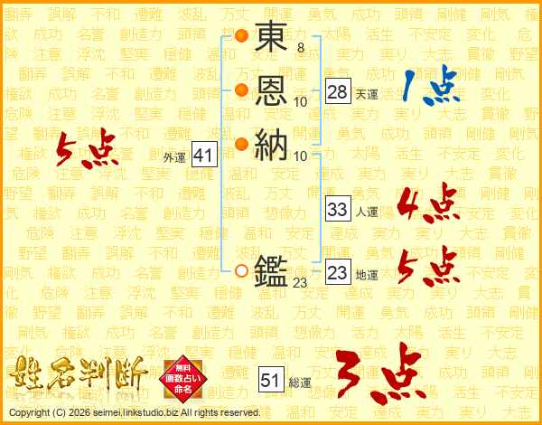 東(8画)恩(10画)納(10画) 鑑(23画)