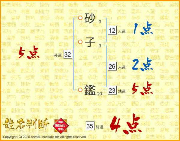 砂子鑑さんの総運は35画の4点!
