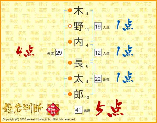 木(4画)野(11画)内(4画) 長(8画)太(4画)郎(10画)