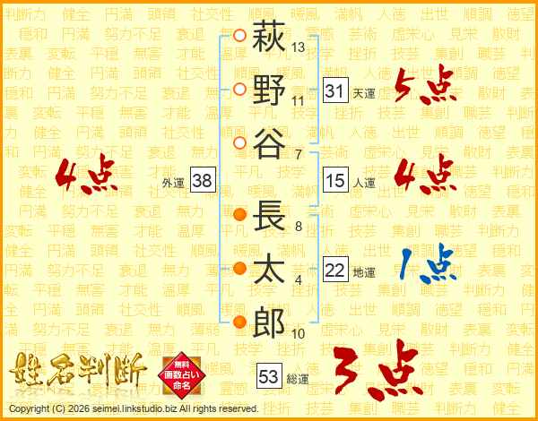 萩(13画)野(11画)谷(7画) 長(8画)太(4画)郎(10画)
