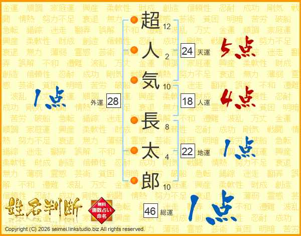 超(12画)人(2画)気(10画) 長(8画)太(4画)郎(10画)