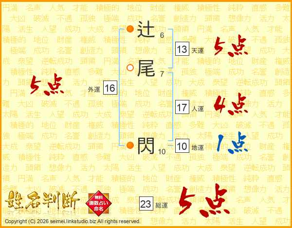 辻尾閃さんの総運は23画の5点!