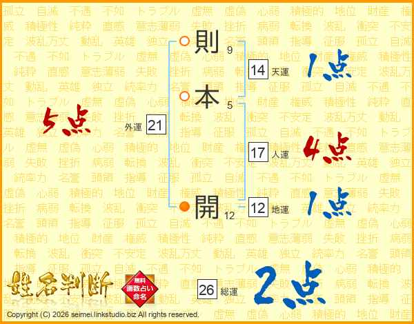 生活面を象徴する運勢です。外部から受ける影響力を表し、結婚運、家庭運や職場、環境への順応性を表します。総運から人運を引いた画数。姓や名が1文字の場合を除く。