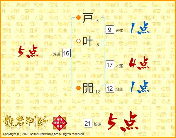 生活面を象徴する運勢です。外部から受ける影響力を表し、結婚運、家庭運や職場、環境への順応性を表します。総運から人運を引いた画数。姓や名が1文字の場合を除く。