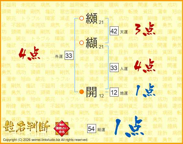 生活面を象徴する運勢です。外部から受ける影響力を表し、結婚運、家庭運や職場、環境への順応性を表します。総運から人運を引いた画数。姓や名が1文字の場合を除く。