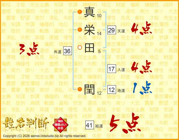 生活面を象徴する運勢です。外部から受ける影響力を表し、結婚運、家庭運や職場、環境への順応性を表します。総運から人運を引いた画数。姓や名が1文字の場合を除く。