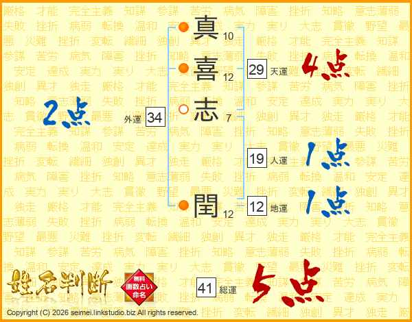あなたの人生を表す1番重要な運勢です。生涯を通じて影響する総合運となり、主に50歳以降の晩年期に影響を及ぼします。苗字と名前の合計画数。