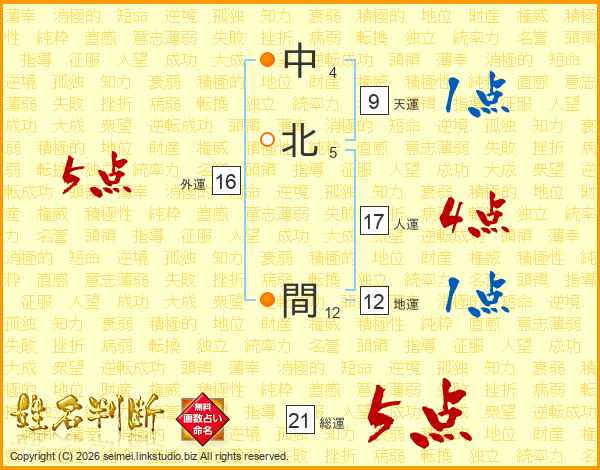 中北間さんの総運は21画の5点!